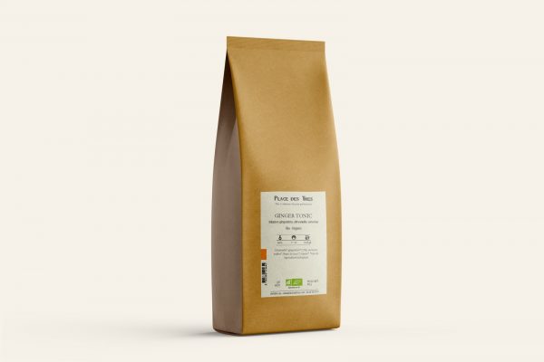 Ginger Tonic BIO – Tisane épicée et fraîche : gingembre (21%), citronnelle, verveine, souci et mauve. Tasse dorée, bouche tonique et douce. 12–15 g/L, 7–10 min à 100 °C.